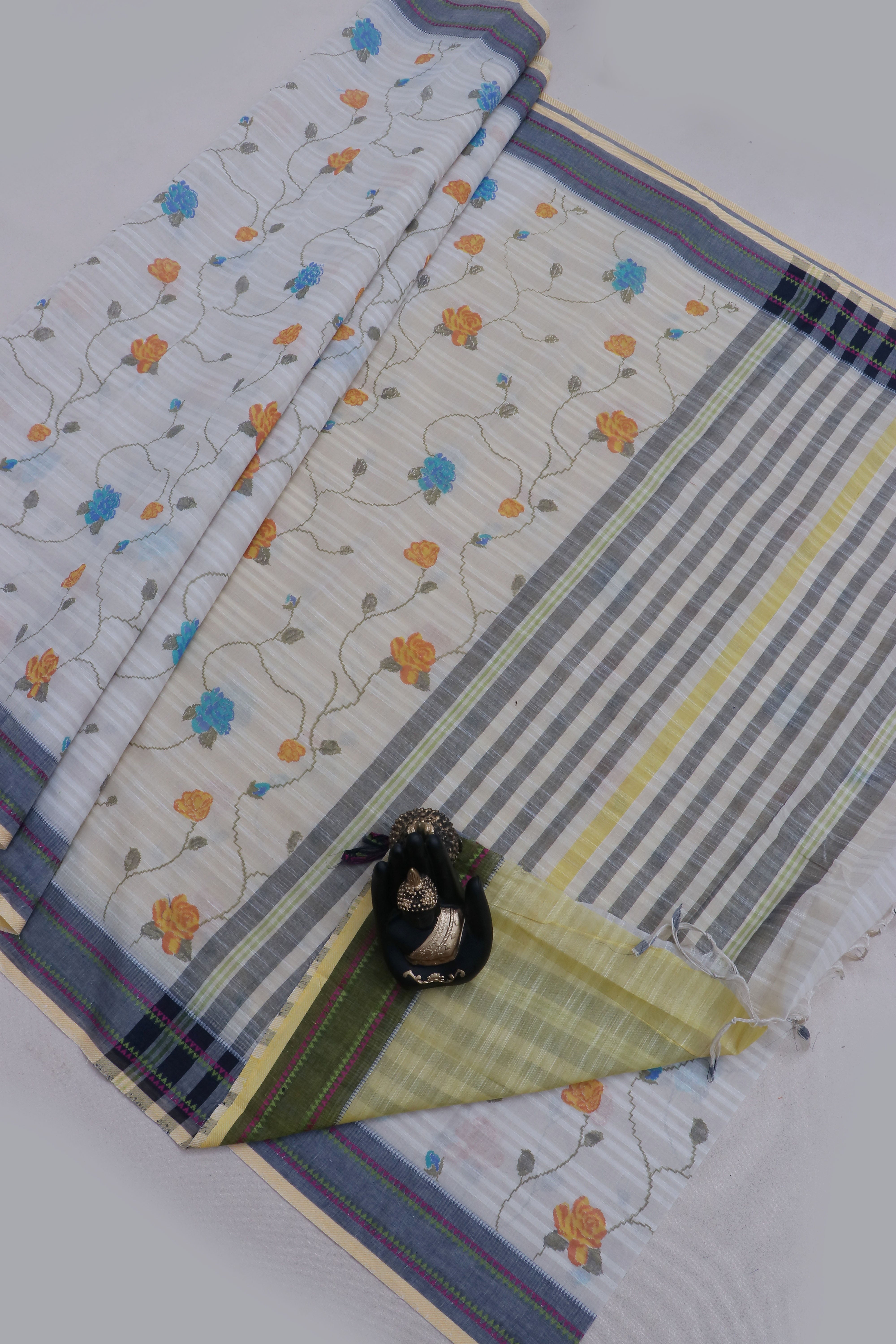 Pure Kanchi cotton base in a soft off-white hue, enhanced with digital floral prints inspired by temple art and traditional South Indian motifs, offering a graceful and breathable drape.