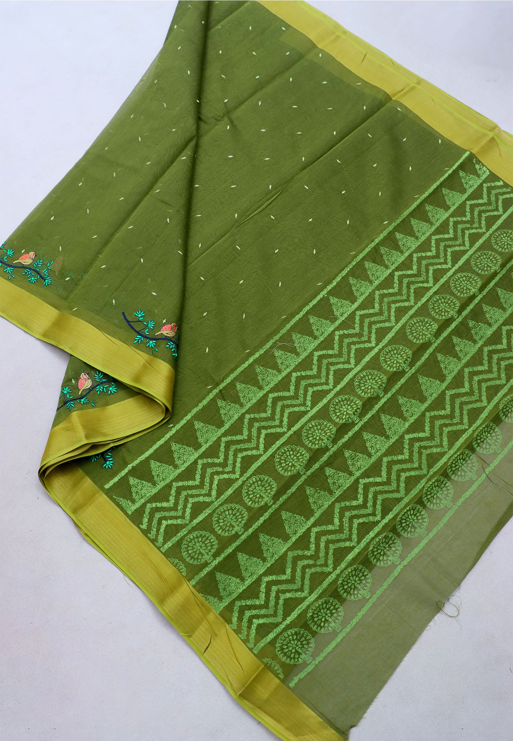 Contrasting wide borders featuring ornate zari-style threadwork and embroidered patterns in rich hues—adding definition and regal charm to the lightweight body.