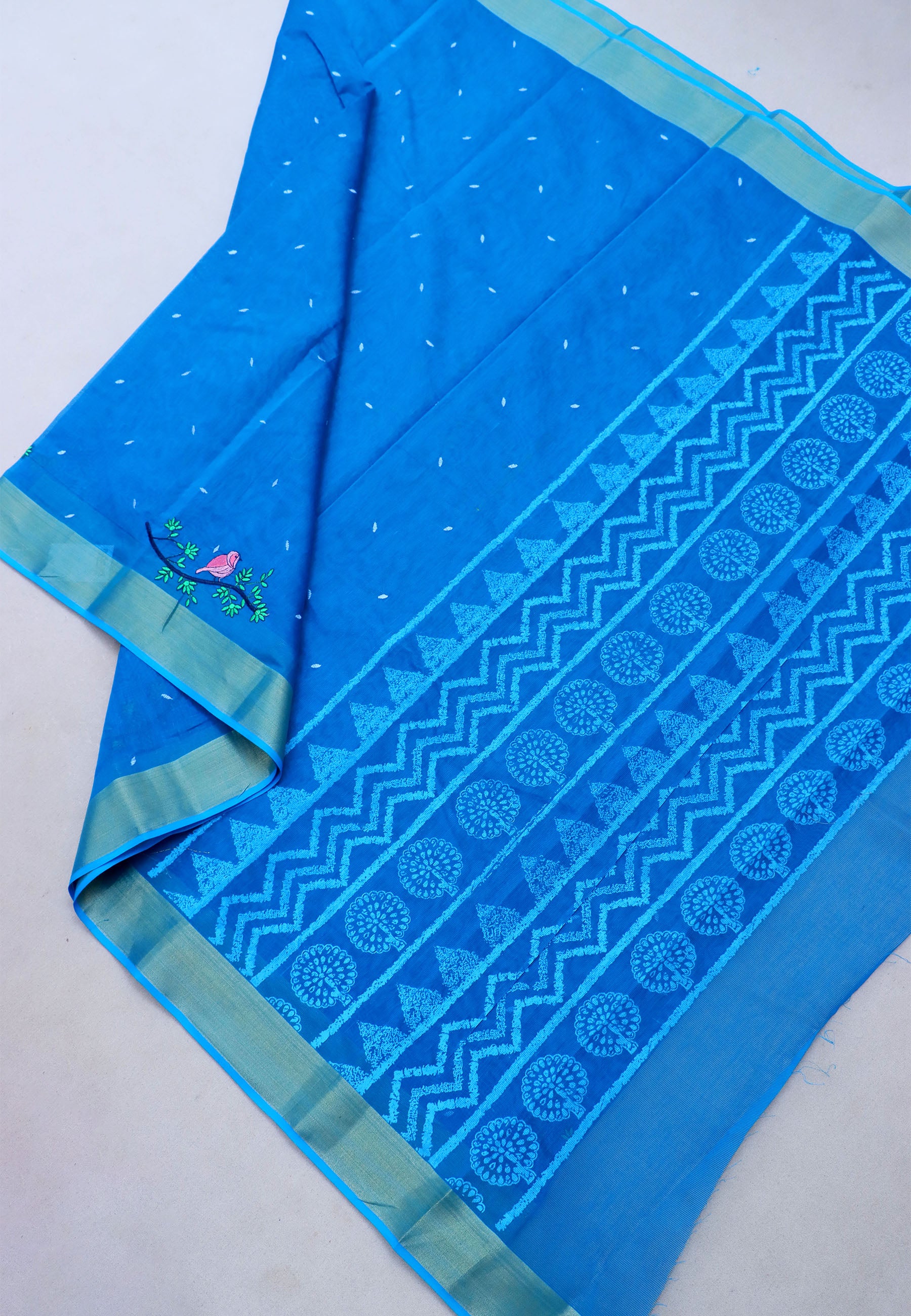 Contrasting wide borders featuring ornate zari-style threadwork and embroidered patterns in rich hues—adding definition and regal charm to the lightweight body.